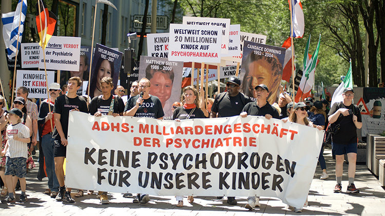 De bar et stort banner som forkynte: «ADHD: En milliardforretning for psykiatri – ingen psykiatriske medikamenter for våre barn.» Demonstranter bar plakater som beskrev tilfeller av overgrep på unge innen psykiatri. Dette inkluderer det faktum at i dag minst 20 millioner barn tar psykiatriske medikamenter verden over, medikamenter som kan inkludere «bivirkninger» som tanker om mord eller selvmord. Plakater gjorde det også klart at «Barndom er IKKE en psykisk lidelse».